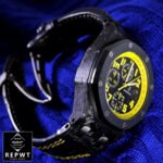 The dial is black and yellow with Arabic numerals as indices. The hour markers are made of 904L stainless steel and the hands are stick-shaped and made of 904L stainless steel. The watch has a variety of functions. including hours. minutes. small seconds. date. and chronograph. It has passed the 30m water resistance test and is protected by a full 2 year international United Luxury warranty. All of the features are arranged and finished to perfection. making it indistinguishable from the authentic watch.