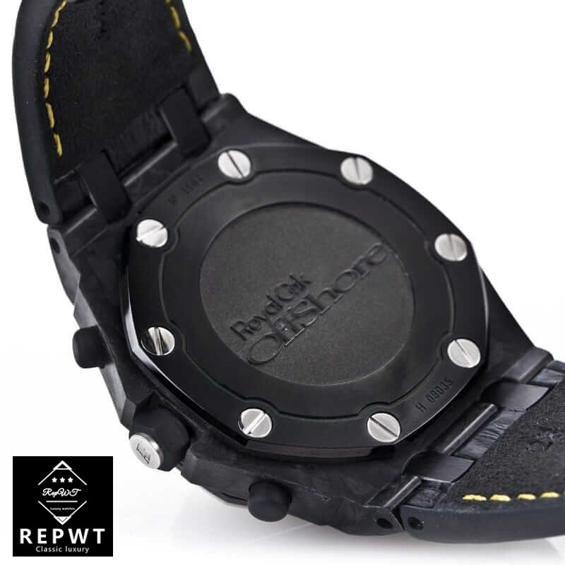 This Audemars Piguet Royal Oak Offshore Replica. model number 26176FO.OO.D101CR.02. is a 1:1 super clone Swiss mechanism watch. It features an automatic movement with a caliber of AP 3126 / 3840 and a power reserve of 60 hours. The case is made of 904L stainless steel and is black in color. The bezel is also made of 904L stainless steel and is black in color. and the crystal is sapphire. The bracelet is made of crocodile leather with yellow contrast stitching. and the clasp is a deployment clasp made of 904L stainless steel.